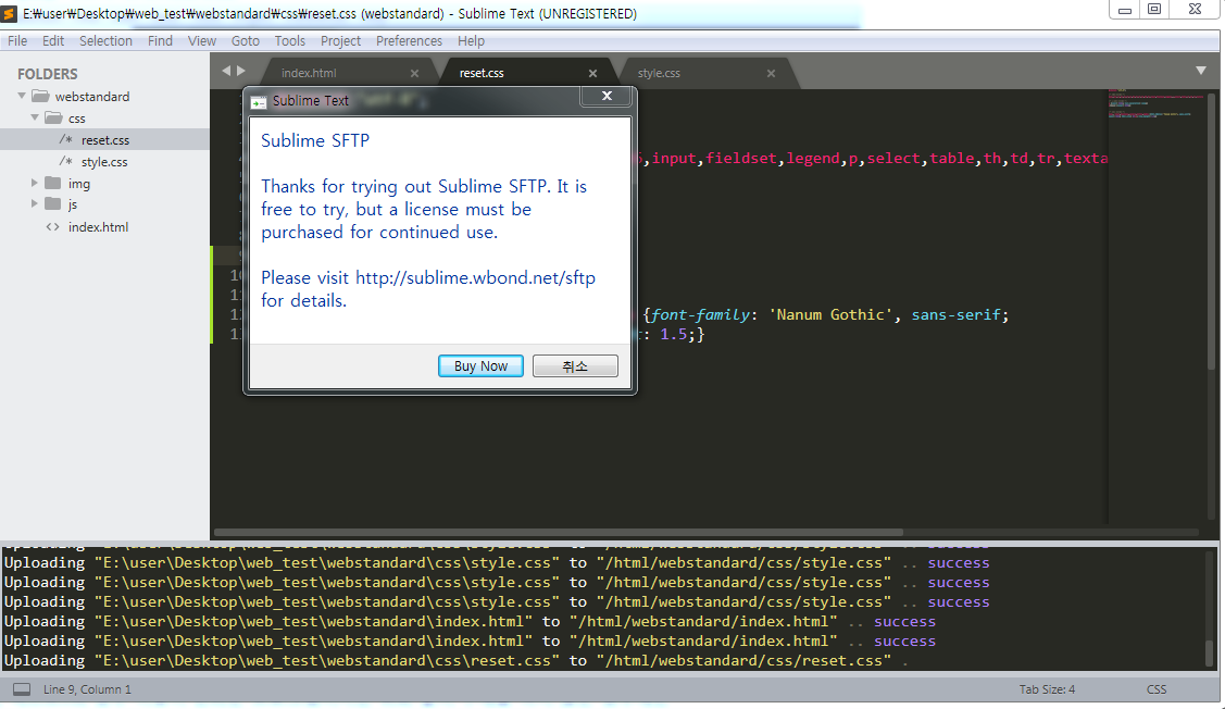 서브라임 텍스트3의 경우 이용이 편리한 프로그램이지만 위와 같이 구매를 하지 않은 경우에는 종종 위와 같은 화면이 뜹니다. 하지만 구매하지 않으셔도 이용 가능하니 취소 버튼 누르시면 됩니다. 코딩 시에 위와 같은 화면이 거슬리시는 분은 구매 하셔도 괜찮습니다.