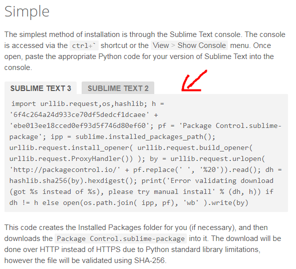 Installation Simple The simplest method of installation is through the Sublime Text console. The console is accessed via the ctrl+` shortcut or the menu. Once open, paste the appropriate Python code for your version of Sublime Text into the console. Sublim