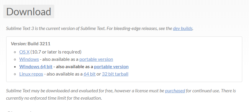 Sublime Text 3 is the current version of Sublime Text. For bleeding-edge releases, see the dev builds. Sublime Text may be downloaded and evaluated for free, however a license must be purchased for continued use. There is currently no enforced time limit f