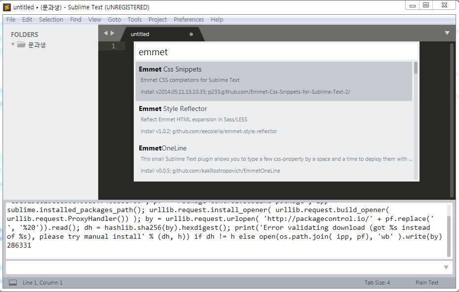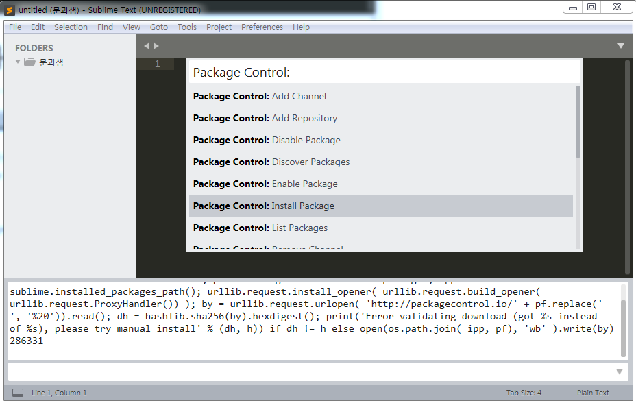 5) 확장 기능을 설치하기 위해 위의 Package Control을 클릭하면 아래와 같은 화면이 뜹니다.